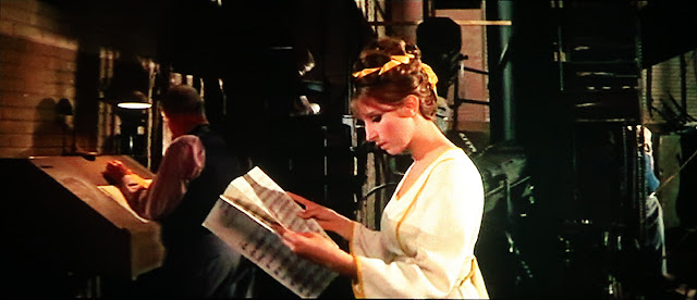 And here in a production shot of a bit that was cut but intended to be in the middle of the scene, we get more of the adjacent wall, looking like a typical theatre back wall. Note a bit of the little bridge up at strip light height, as seen in a shot in the audition scene. Thanks to the Barbra Archives for
