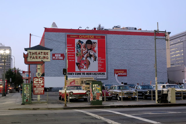 For shots of Grauman's Chinese as it was in 1969 the production went downtown to 3rd & Spring where the crew recreated the parking lot that used to be east of the Chinese. In 1979 the Mann Chinese Twin was built east of the vintage theatre. Now part of the Hollywood and Highland mall is on the property. The shoot was July 26, 2018.